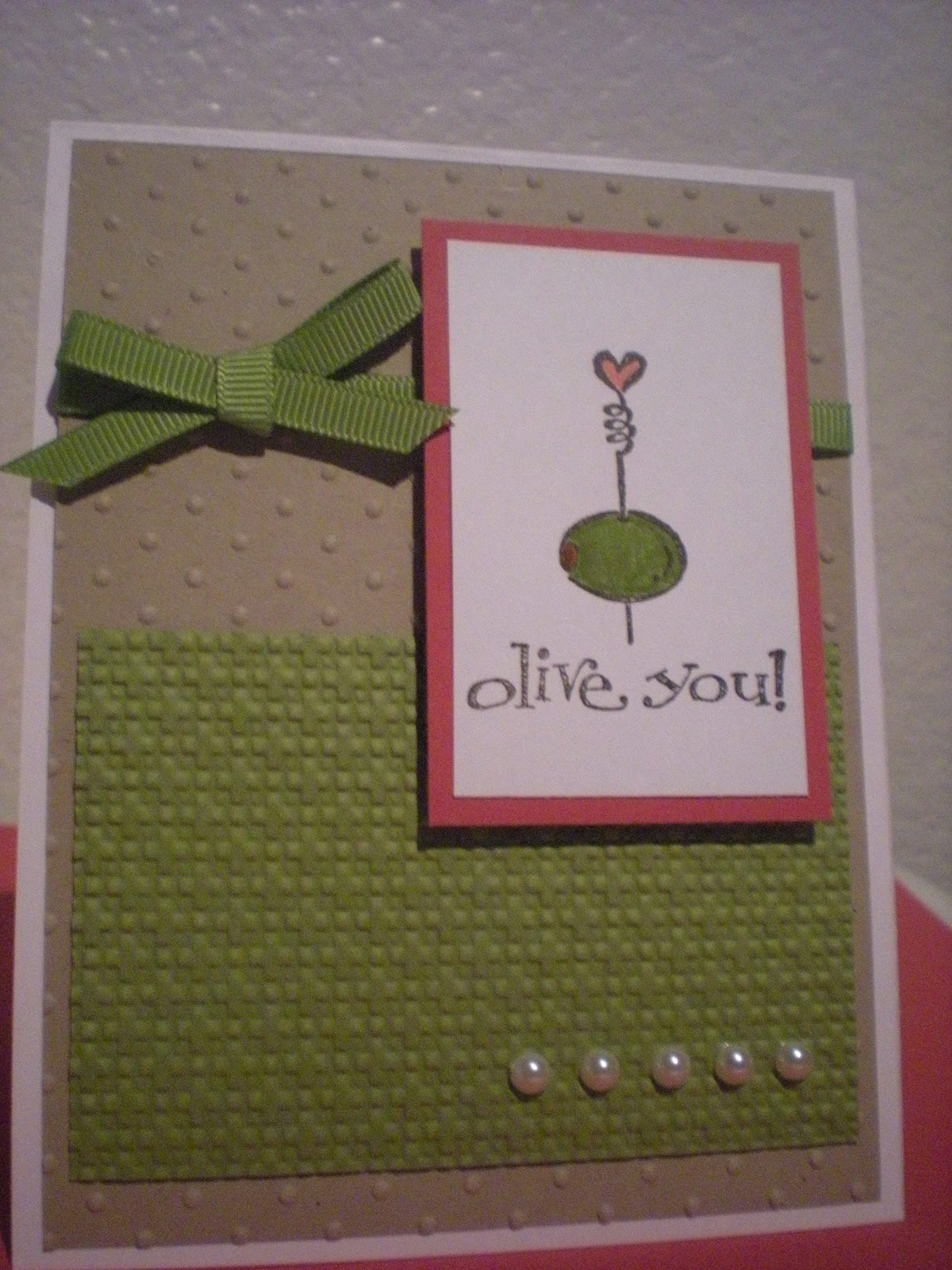 Today I have another Valentine's/Love card to share with everyone. I used the SU! Olive You stamp set to creat this card! I think this set is too cute! I have officially determined that I'm obsessed with the Square Lattice and Polka Dot embossing folders! I find myself turning to them for almost every card I make! I think it's time for me to get some NEW embossing folders!!